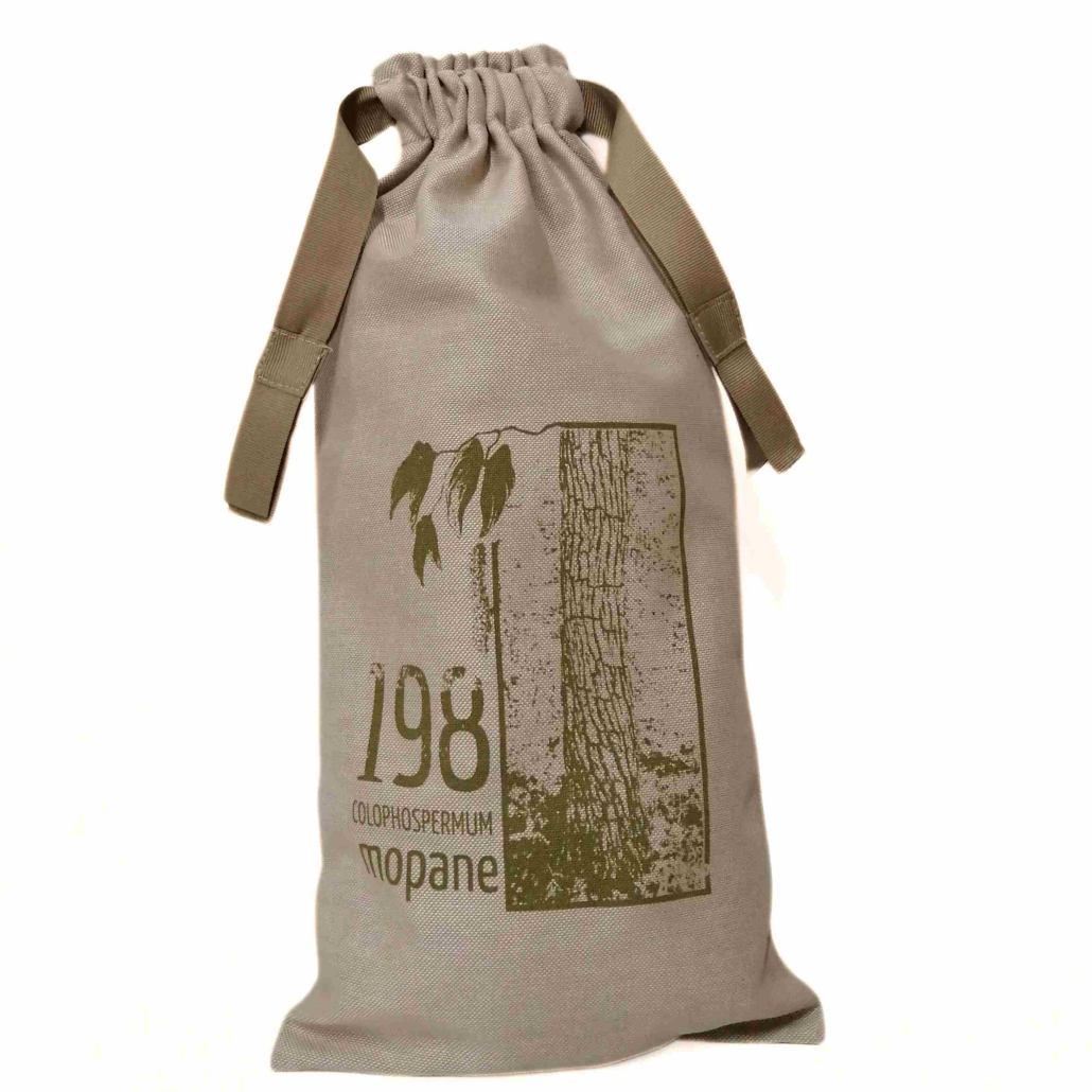 A stylish drawstring bag with Mopane tree detail printed on a mock linen fabric.